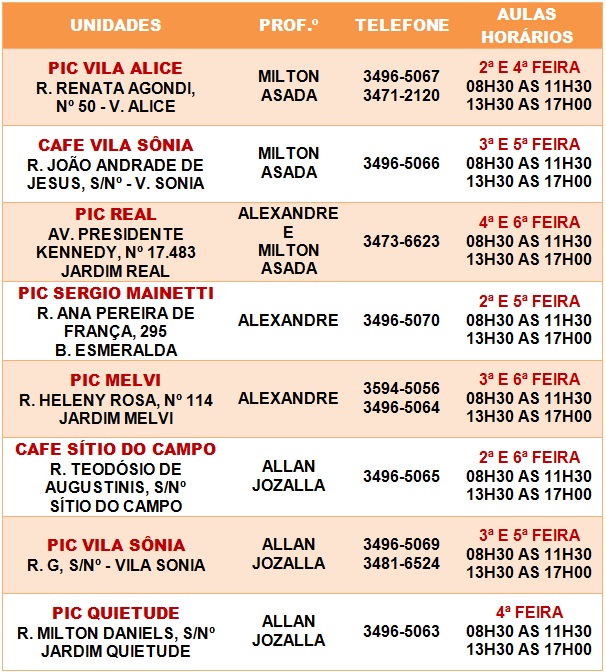 PARA MAIORES INFORMAÇÕES ENTREM EM CONTATO COM OS PROFESSORES NOS ENDEREÇOS DENTRO DO HORÁRIO DE CADA UNIDADE OU PELO TELEFONE .